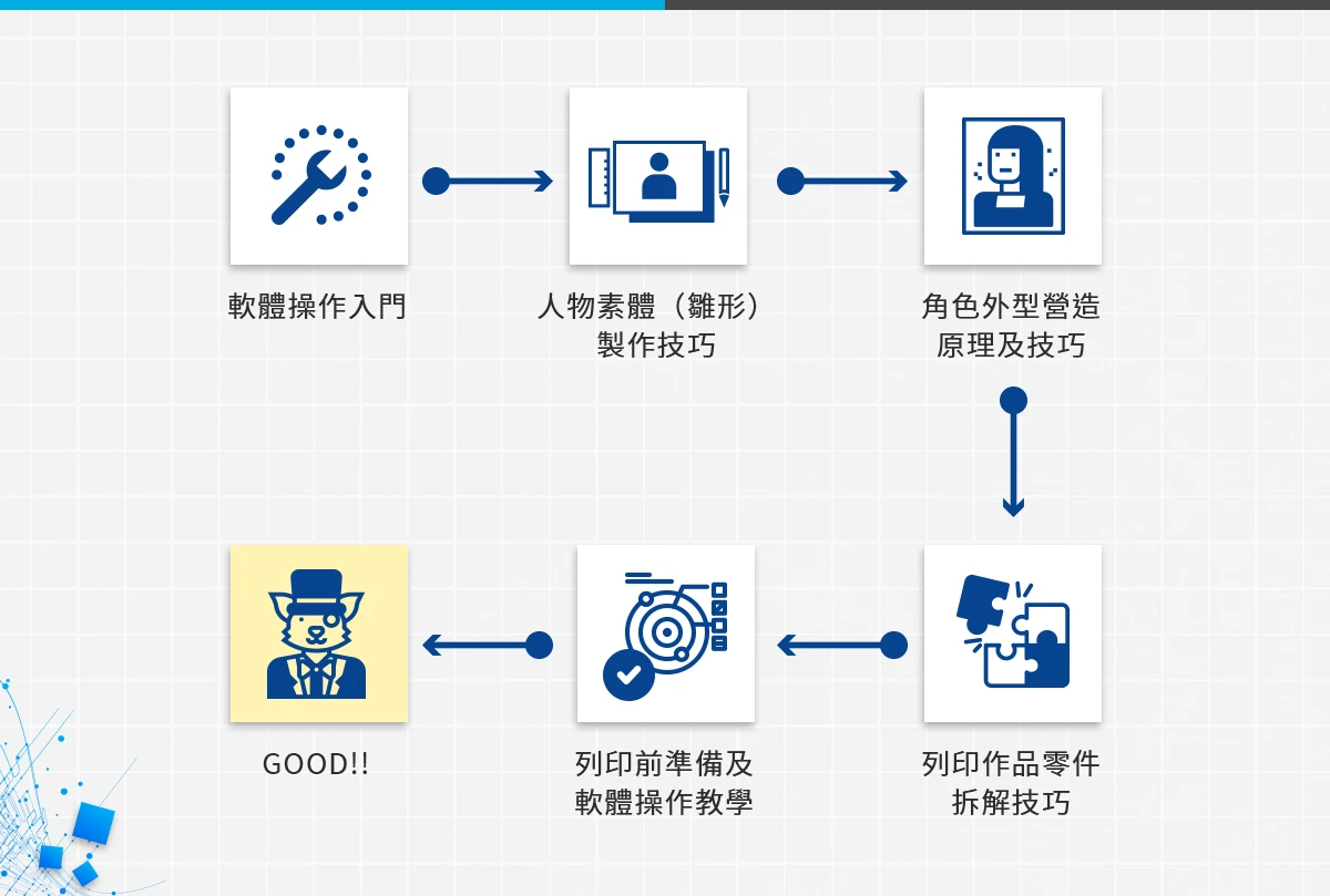 本課程透過五大歷程,從軟體操作入門到輸出等進行完整說明,完備數位角色原型創作到 3D 輸出的知識與技能。