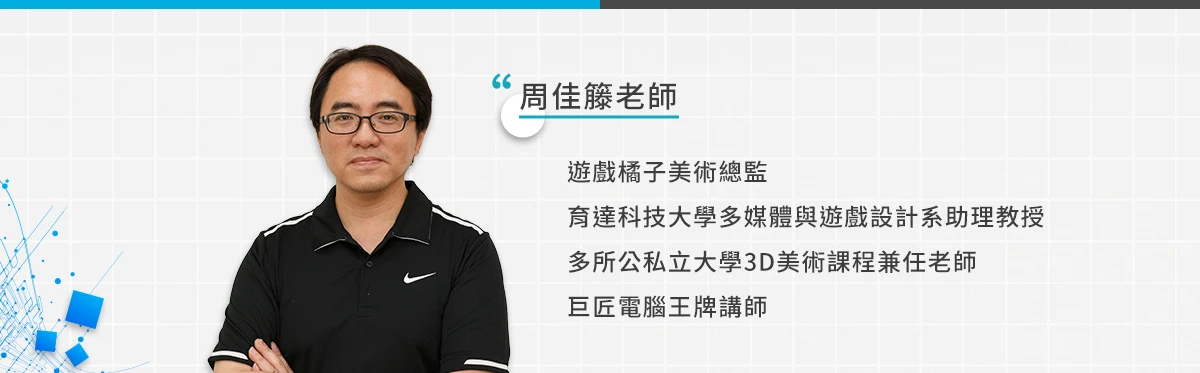 周佳籐老師從事 3D 多媒體設計資歷超過 20 年,專精於 ZBrush、Maya、3ds Max、3D 印前軟體(Mesh mixer)、數位原型角色創作等領域。本身除了擁有豐富的業界經驗,更憑藉著多年的各大學及電腦補教經驗,指導學員成為多媒體遊戲設計師以及動畫製作 3D 美術設計師。