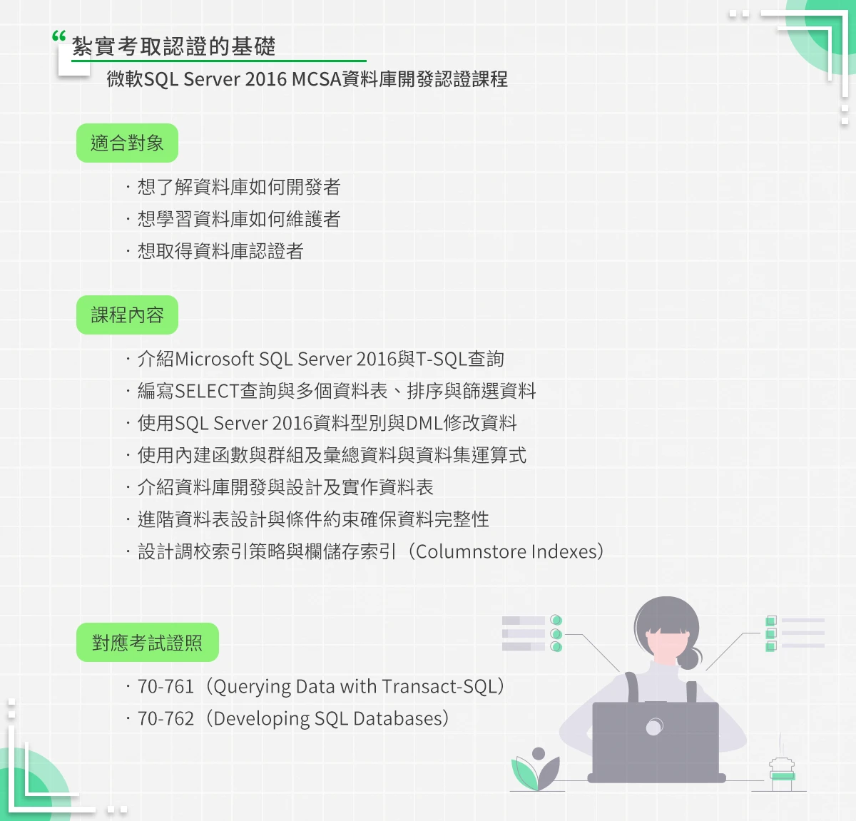 考前衝刺最佳選擇,趕緊報名課程,增加考取「微軟 SQL Server 2016 MCSA 資料庫開發」認證的機會吧!