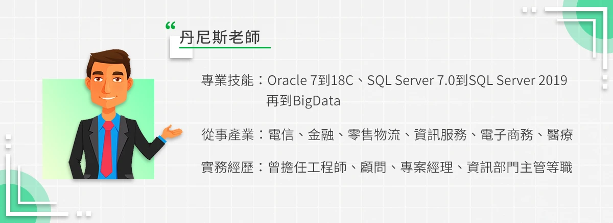 丹尼斯老師從事資料庫教學工作已超過二十年,從 Oracle 7 到 18C、SQL Server 7.0 到最新的 SQL Server 2019 再到 BigData,持續地研究與精進。業界實務經驗更是豐富,產業涵蓋電信、金融、零售物流、資訊服務、電子商務及醫療業,目前擔任某大型連鎖醫院資訊部門主管。