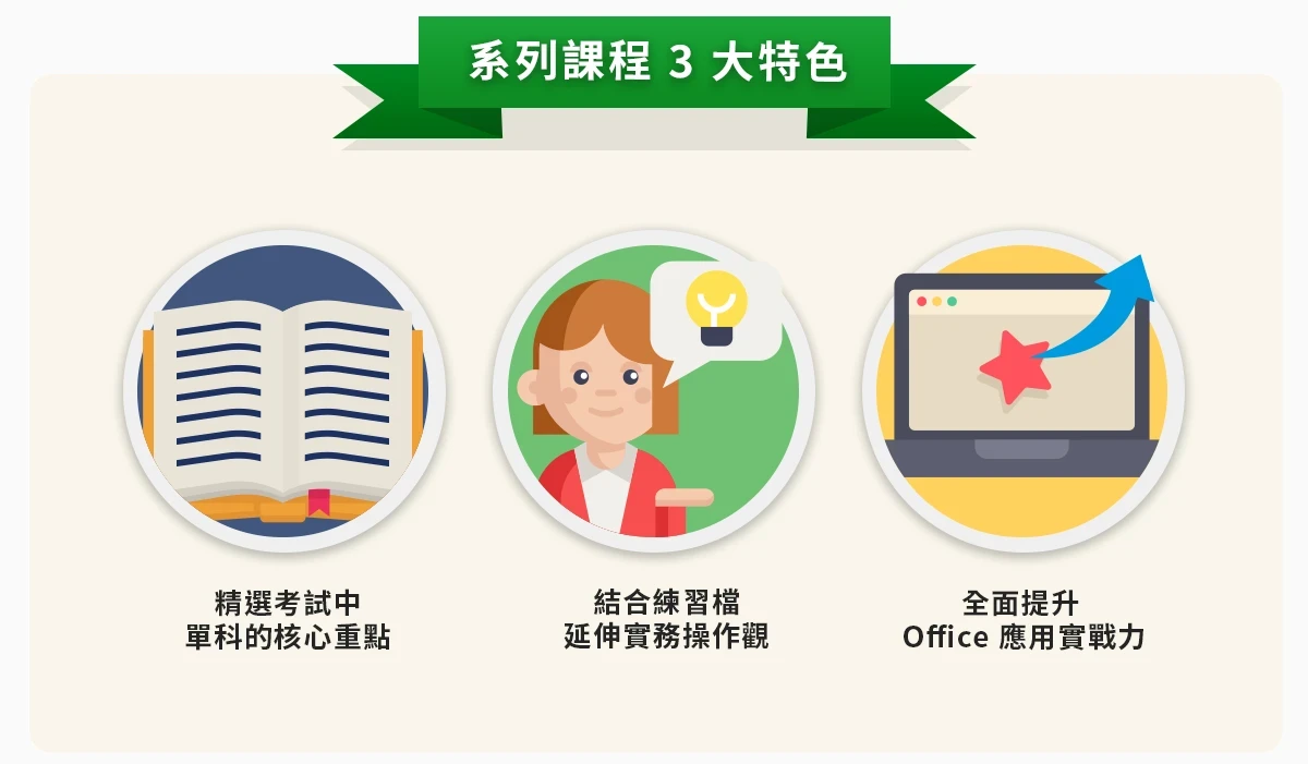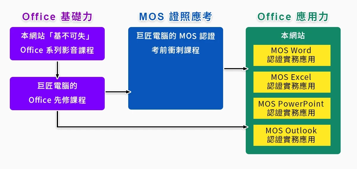 而尚未取得 MOS 認證資格的同學,除了購買本課程,還可透過巨匠電腦 MOS 認證考前衝刺課程,來協助同學順利取得 MOS 大師級認證。 更多豐富內容全收錄在系列課程中,趕緊加入課程,增加取得 MOS 認證的機會,更擁有相應的 Office 實務應用技巧吧!