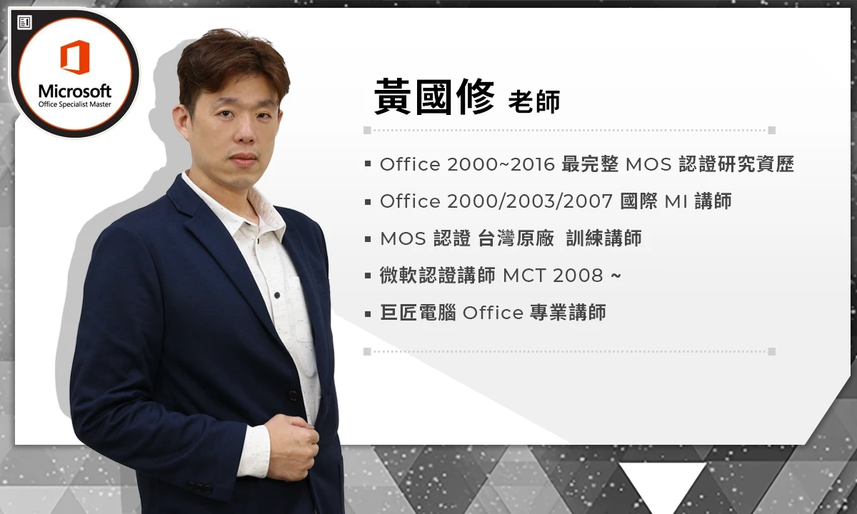 「MOS 認證實務應用課程」是由黃國修老師做整體規劃與設計,老師相當重視 Office 軟體操作與商業職場整合應用,是國內極少數通過 MOS 認證各版本全系列認證的專業講師,也是 MOS 認證導入國內的第一批講師,從 MOS 2000 起到最新的版本均有研究,是目前國內最資深,且站在第一線的認證研究講師。 同時,更一手打造 Office 軟體應用訓練團隊,不僅在各領域推廣辦公室軟體,還培育講師持續經營軟體整合應用領域,負責眾多企業的教育訓練,並協助企業數位化,導入 Office 365 以提升工作效率與整合運作。