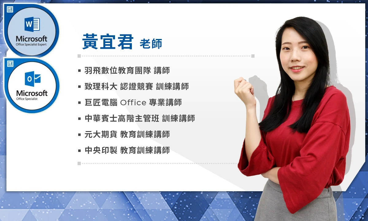 「MOS Word」與「MOS Outlook」課程的講師為黃宜君老師,學生時期即為 MOS 競賽選手,畢業後投入教學研究並培養 MOS 世界盃選手,是 2018 年 MOS Word 世界冠軍林佳怡的指導老師。
