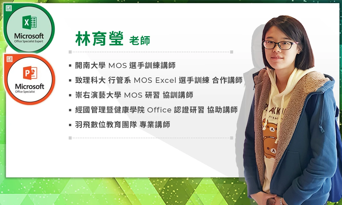 「MOS Excel」與「MOS PowerPoint」課程的講師為林育瑩老師,MOS 世界盃選手出身,曾擔任多所學校的 MOS 選手培育養成,同時也是 2015 年 MOS Excel 的世界季軍。