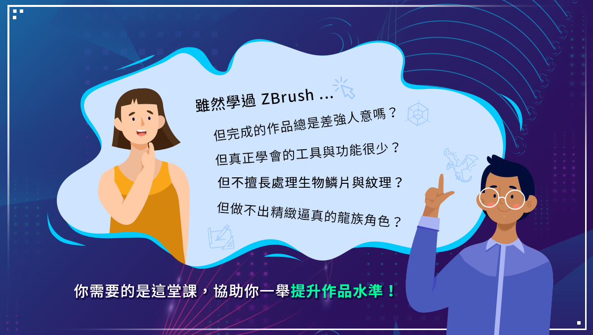 ※本課程屬 ZBrush 進階課程,適合已熟知 ZBrush 大部分功能的使用者。