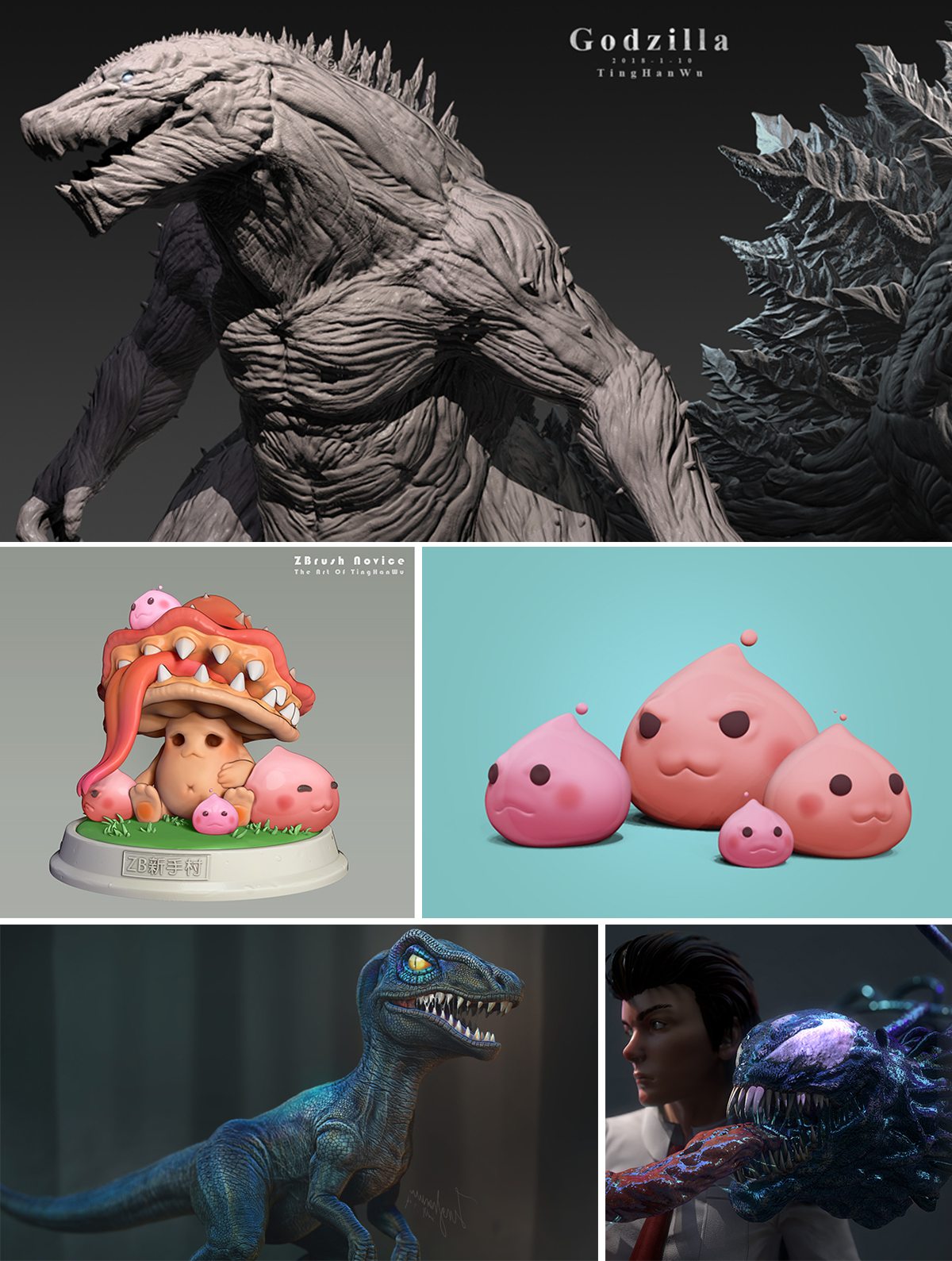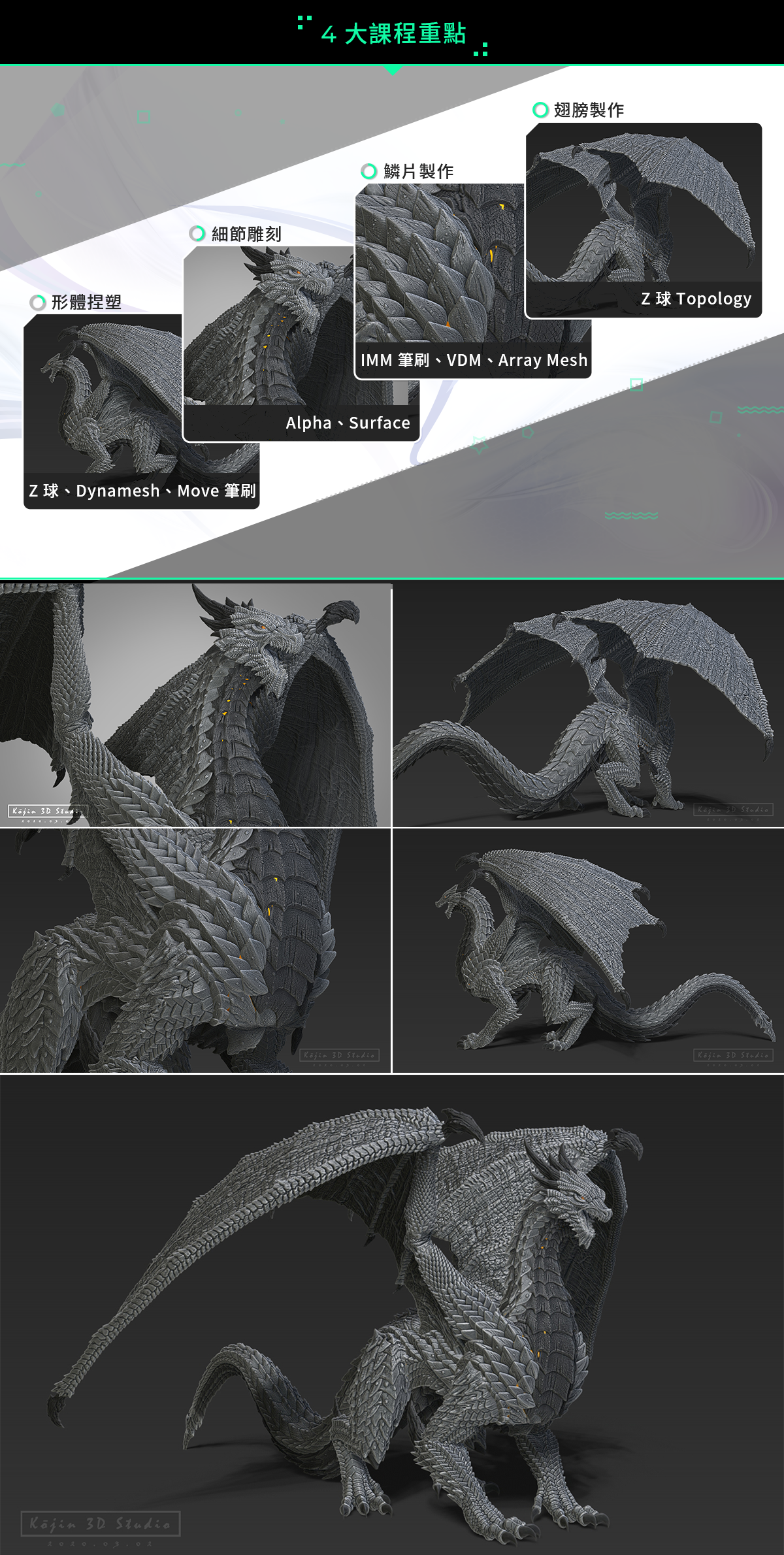 ZBrush軟體應用範圍非常廣,像是遊戲業、動畫業、影視業、廣告業、公仔玩具業、3D 列印等產業,都有很高的機率會運用到這款軟體。 這些產業所各自做出的成品,如遊戲、動畫、電影、模型等,其中除了一般常見的人物角色外,也千萬別忘了出現比例也不低的 Boss 角色,而這些角色通常是以龍族、怪獸等樣貌呈現。所以,只要學會如何製作精緻的生物類型角色,你在求職之路上就能有更多元的選擇! 除了本課程,後續還會有「材質篇」與「動畫篇」,完整學習將能使 3D 角色的完成度更高,也增加能應用的產業範圍。