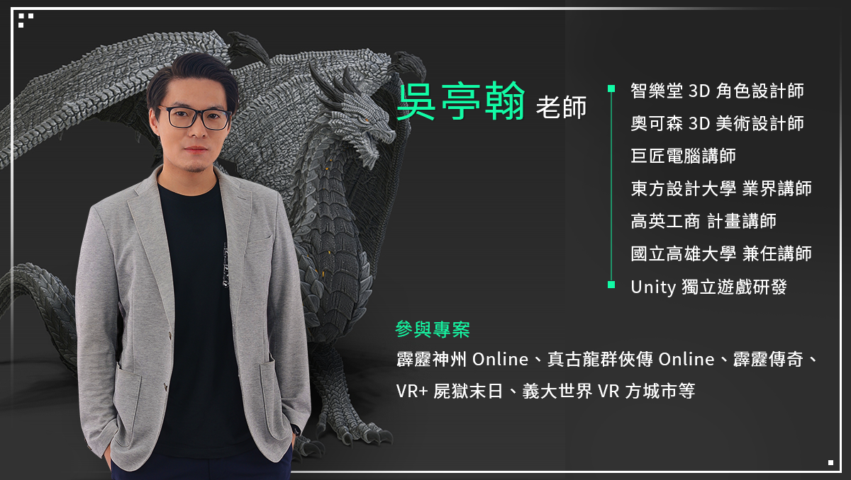 吳亭翰老師專長在次世代角色與場景製作、風格化角色製作、影片後製剪輯與遊戲開發設計領域,進入遊戲相關產業已有數年之久,因參與過多款萬人線上遊戲、手機遊戲、遊戲宣傳片及 VR/AR 遊戲製作等,故最能理解業界喜好與潮流之脈絡。