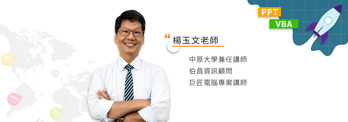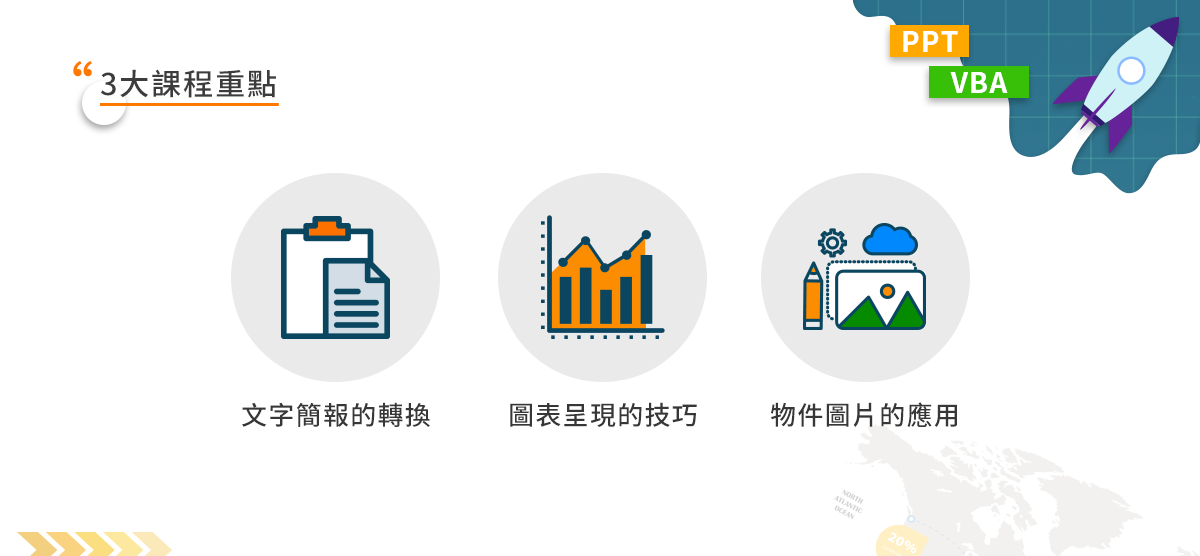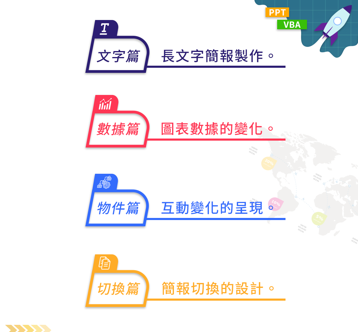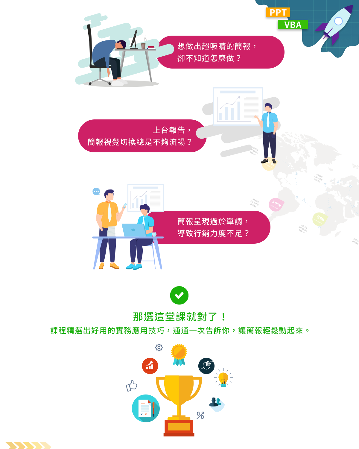 課堂上,教你進階的簡報工具與動態互動的簡報 VBA,進而改善簡報製作手法,讓簡報製作過程更有效率,做出來的成品也更加完美!
