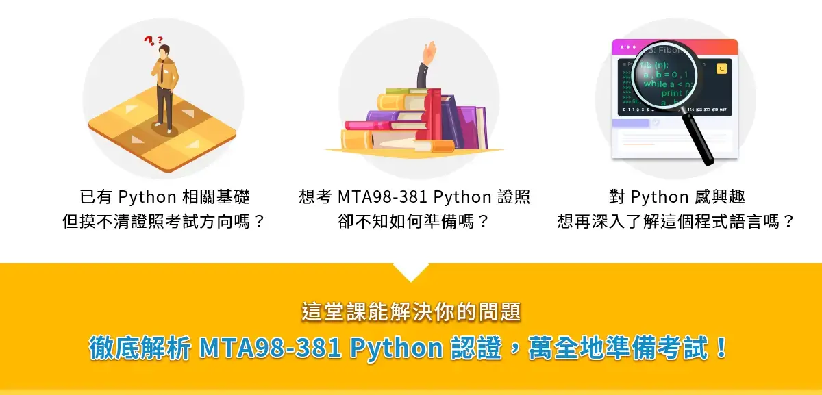 因此,本課程教學 Python 程式語言,並針對 Microsoft MTA 98-381 認證進行解題,不僅帶你更深入學習 Python,也讓你可以充分準備 Microsoft MTA 98-381 認證考試,帶你了解考試方向與常考題型。