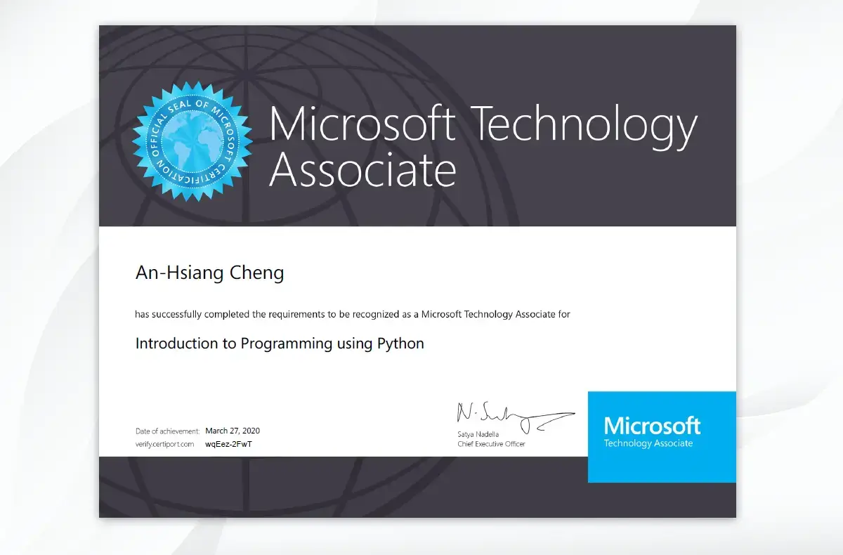 Microsoft MTA 98-381 認證是 Microsoft 公司所推出,考核應試者關於 Python 程式語言的核心觀念及開發能力的證照,具有國際公信力,廣為各大企業及學校所認可。