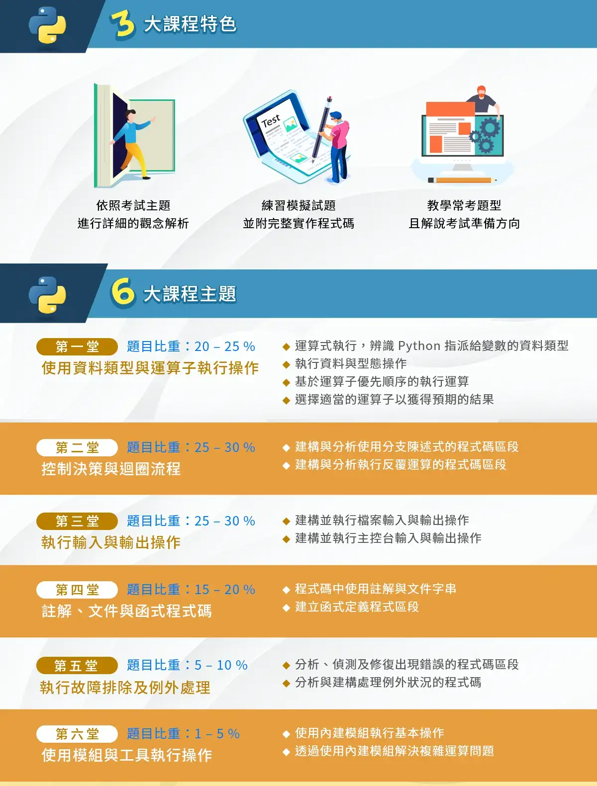 課程共有 6 大章節,與大量的模擬試題,老師將依據考試主題單元進行理論與觀念的解說;此外,也將帶你實作練習模擬試題,並且每一題皆附有完整實作的程式碼,幫助你全面準備認證考試,在考取證照的路上能夠更加順利。上完課,你就能掌握 Microsoft MTA 98-381 認證考試的方向,並對 Python 程式語言有更深一層的認知!