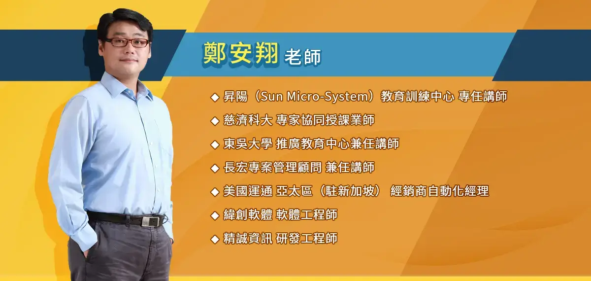 鄭安翔老師為英國約克大學電腦碩士,以及歐洲工商管理學院/北京清華大學 EMBA。專長在 Java SE/EE/Framework 程式設計、Google Android APP 程式設計、物聯網應用開發、Python 程式開發、AI 人工智慧平台技術應用等領域,擁有多年程式開發的業界實務經驗,過去曾參與多項金融業大型系統開發專案。在教學上,則具有高度的教學熱忱,也持續學習新技術,並樂於與學員們分享。