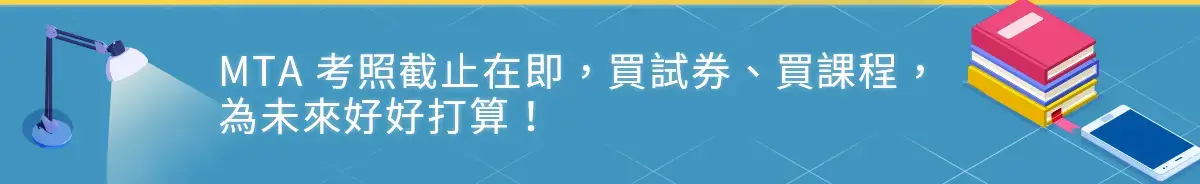 別忘了,於 2021 年 6 月 30 日前購買 MTA 許可證(試券),一張一次機會,直到 2022 年 6 月 30 日都能考。 買了許可證,還有一年的準備時間,立刻購買課程,老師將給你最有效的後援、最精闢的解析,帶你攻克考試,考取證照!