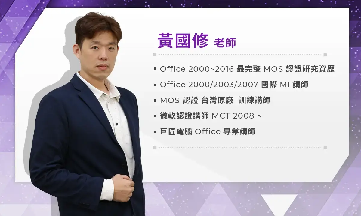 「基不可失系列課程」是由黃國修老師做整體規劃與設計,老師相當重視 Office 軟體操作與商業職場整合應用,更在乎同學能否真的吸收並轉換成自己的能力。20 年來始終堅持在辦公室應用軟體的教學,跨版本接觸的經驗,讓老師更加理解版本升級當中的進化與改變。而為了讓所有 Office 的使用者都能輕鬆應用軟體,不論常見或是冷門的軟體,老師都堅持為學習者提供一個學習管道。 此外,老師更一手打造 Office 軟體應用訓練團隊,不僅在各界推廣辦公室軟體,還培育講師持續經營軟體整合應用領域,負責眾多企業的教育訓練,並協助企業數位化,導入 Office 365 以提升工作效率與整合運作。