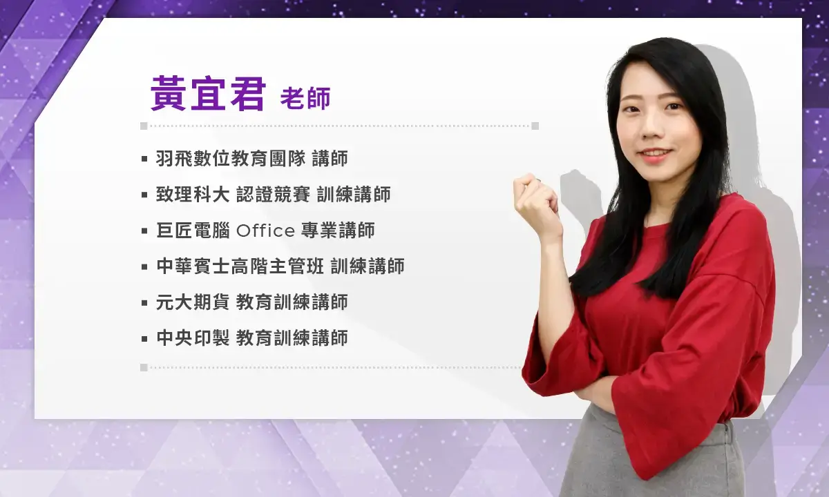 錄製課程的黃宜君老師,學生時期即為 Office 認證競賽選手,大四就開始接受軟體教學訓練,畢業後全心投入研究。除了教授 Word、Excel、PowerPoint 等為人熟知的 Office 軟體,更堅持以「內外兼具」的觀念提升個人競爭力,推動著 Outlook 與 OneNote 兩套軟體的學習。