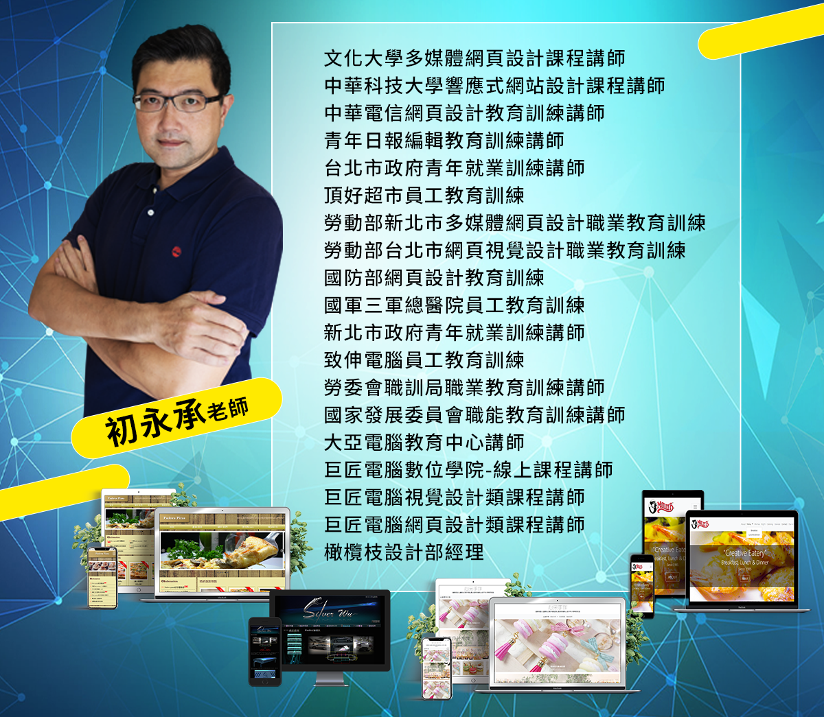 初永承老師擅長的專業在於網頁設計領域,不僅不間斷地自我鑽研,更擔任各大政府機關講師;同時,也在各大專院校與業界教學機構擔任過講師,教學經驗相當豐富,可帶你一步一步學會網頁設計,輕鬆學習無負擔。