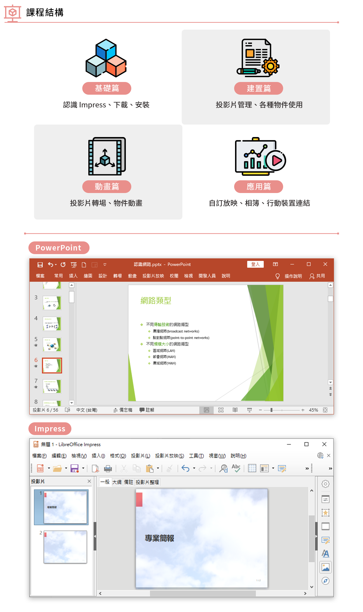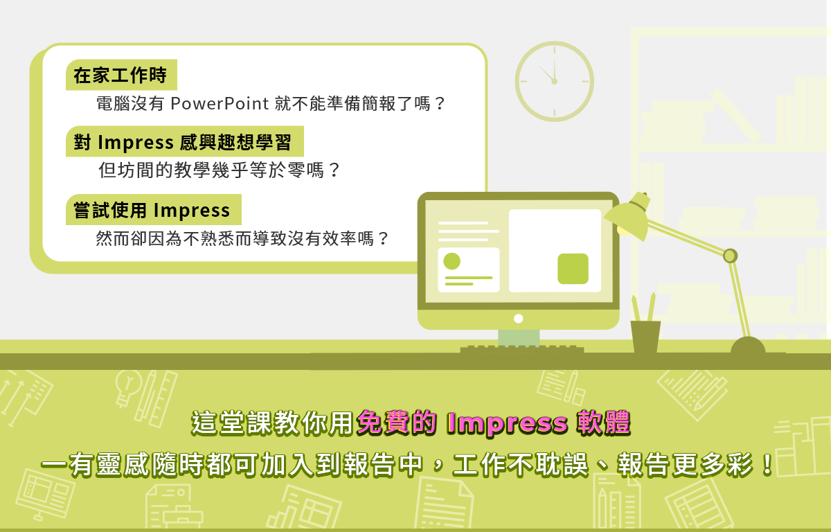 更多關於 Impress 的豐富內容都收錄在這堂課中,快加入課程,學會比 PowerPoint 更便利、更自由的 Impress 吧。