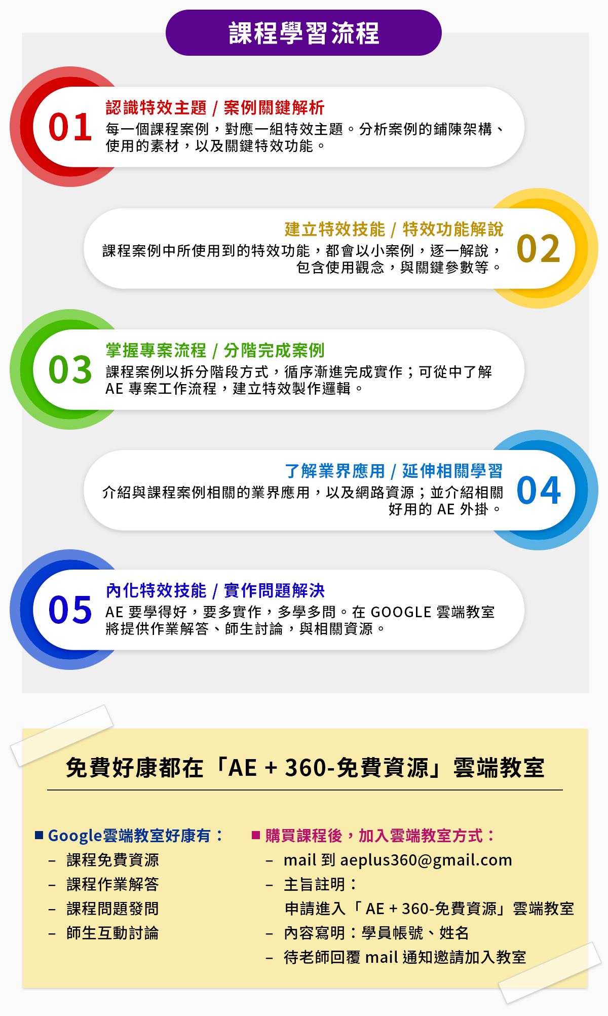 480 分鐘課程影片 + 2 個 AE 特效熱身案例 + 2 個 AE 特效大案例 + 21 個 AE 特效小案例 + 雲端教室無限資源這四科只是開始,後面會持續推出更實用的找工作案例!!