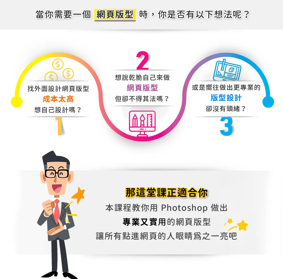 所以,本課程規劃教學上手簡單,不需寫程式就能做出網頁版型的方法,透過各案例的拆解動作,讓初踏入網頁設計的人不僅能掌握設計觀念與規則,更進一步提升 Photoshop 軟體的操作實力。