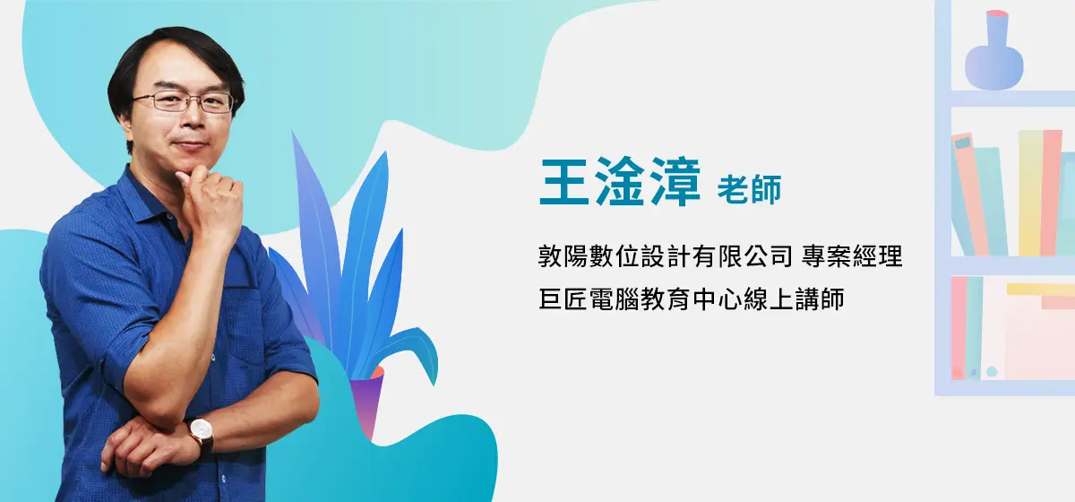 王淦漳老師活躍於平面設計與網頁設計的領域,對設計專業相當熟悉。擅長 Adobe 系列軟體、C#.Net、SQL Server、PHP、MySQL、Web Developer、CSS、JavaScript、jQuery 等各式軟體。現任巨匠講師,教學經驗豐富,擁有多年資訊軟體教學經驗,過去也曾出版過十餘本電腦與美術的相關書籍,如《PHOTOSHOP CS 數位影像合成》等書。