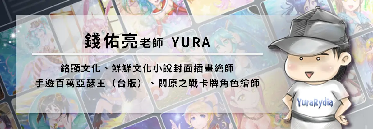 錢佑亮老師對畫圖充滿熱忱,雖不是本科系出身,卻自學成為原畫設計師,並且對 Photoshop、CSP、Painter 等繪圖軟體皆相當熟悉,擅長日系動漫風格的角色創作,曾幫各大出版社繪製小說封面、內頁插畫,也設計過知名手遊的卡牌人物,目前主要從事電繪插畫、漫畫的工作。