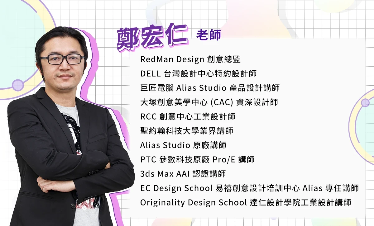 鄭宏仁老師現任 REDMAN STUDIO 創意總監,處理過許多國際級廠商的專案,包含 DELL 電腦 CG 圖像創作、Luxgen GP 內裝數位模型等合作案例,亦曾擔任巨匠電腦產品設計類講師、CAC 資深設計師、Alias Studio 原廠講師。擁有 10 年以上業界教學經驗,將以最專業的角度規劃學習路徑,讓你輕鬆踏入 C4D 設計領域。