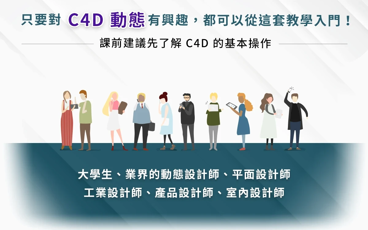 在動態圖像(Motion Graphics)需求極大的業界中,Cinema 4D 因其「上手快速容易」、「介面簡單直覺」、「整合各色軟體」的特性而具有深厚潛力。它簡單易用好上手,且渲染速度快,足以因應平面設計、室內設計、產品設計和最流行的動態設計等相關產業所要求的高效率、高品質專案,更能提升設計廣度。本課程就是為了這樣的設計環境而生,目標是提供一個快速優質的專業課程給設計師或任何想入門 C4D 的人。