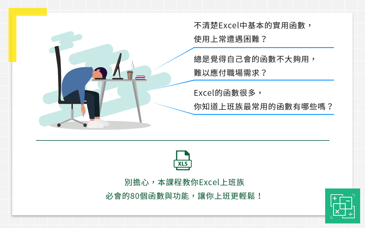 因此,本課程為你整理出上班族在職場工作時最常用到的函數,讓你可以應用這些函數,來解決工作上大部分會遭遇到的狀況,進而大幅提升工作效益。