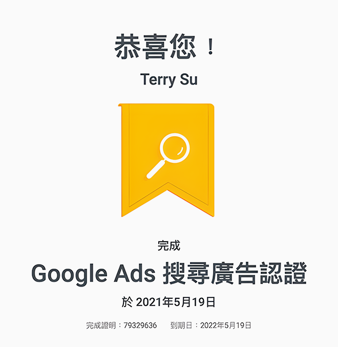 Terry老師 擁有網站規劃、經營、行銷三方面完整的數位營銷經驗,專長於關鍵字行銷、Google搜尋廣告、聯播網廣告、行動廣告及線上影音行銷。