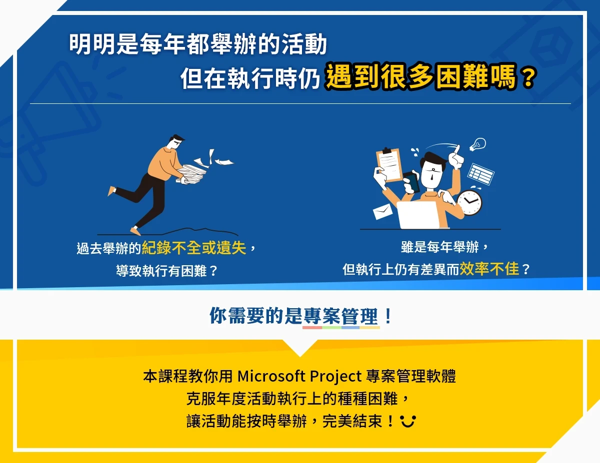 在規劃與執行這類型年度專案時,其 WBS 會隨著專案的複雜度,產生廣度與深度的變化,而本課程選用 Microsoft Project 作為教學主題,教你如何運用它輕鬆管理年度活動專案,使你在計劃專案與管理團隊時能更有效率,並且在面對不同的利害關係人時,能選取最適當的圖表報告,如甘特圖、網狀圖,讓其可快速理解該專案的執行狀態。