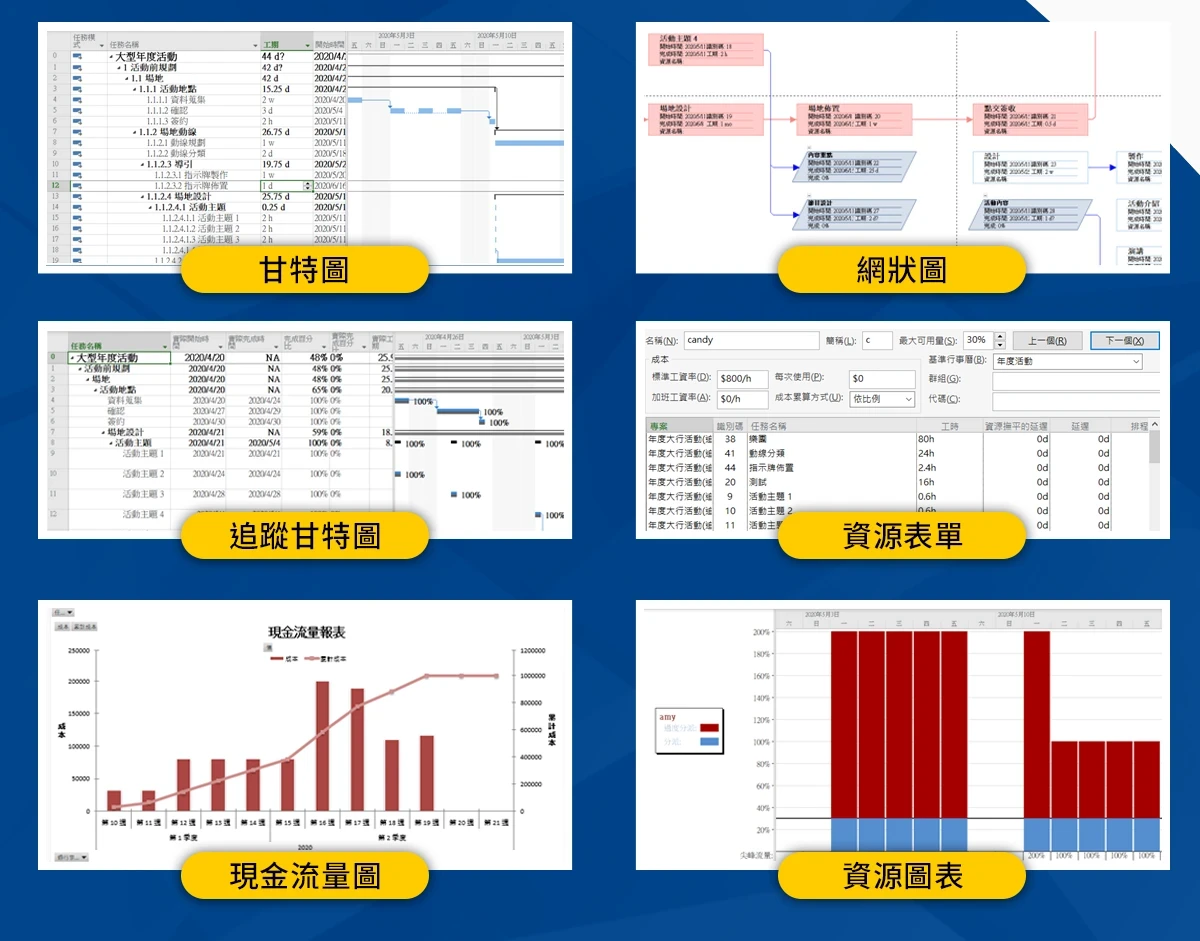 在約6小時的課程中,老師將帶領學習者從認識專案設計開始,熟習 Microsoft Project 近百個介面視窗,了解在不同階段該選用哪些視窗編輯,進而達到活用的目標。另外,也會舉出實際案例說明與練習,讓你能融入情境,更清楚各階段的注意事項。課堂上可產出之報表有: