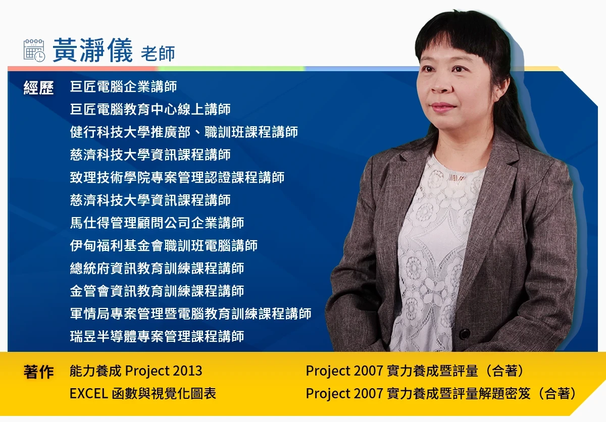 黃瀞儀老師致力於資訊教育的時間已超過十年,專長在於辦公室應用軟體、專案管理軟體、網頁設計軟體與網頁資料庫的教學,並將職場的實務技能融入到課程中,讓學員有所收穫並能回饋於職場。近幾年,則專攻專案管理領域,將專案管理理論、工具及實務結合為一,教學效率管理專案的方法。