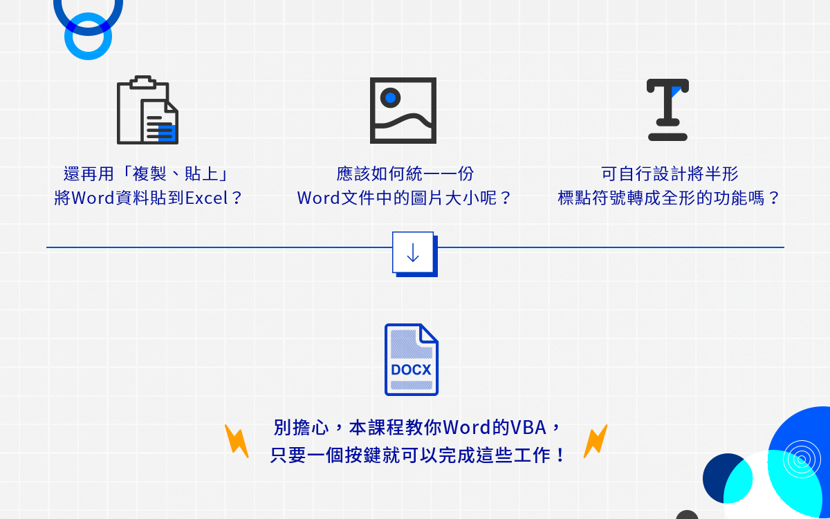 Word VBA可將工作中的常用操作自動化或批次處理,避免一一手動調整,從而大大提高效率與精準度! 所以,如果你需要統一Word長文件中的全形標點符號、圖片大小,或幫圖片、表格插入標號以便建立圖表目次等,只需個別設計出按鈕,就可以統一調整整份文件,快速美化與編輯文件外觀,省時又方便!