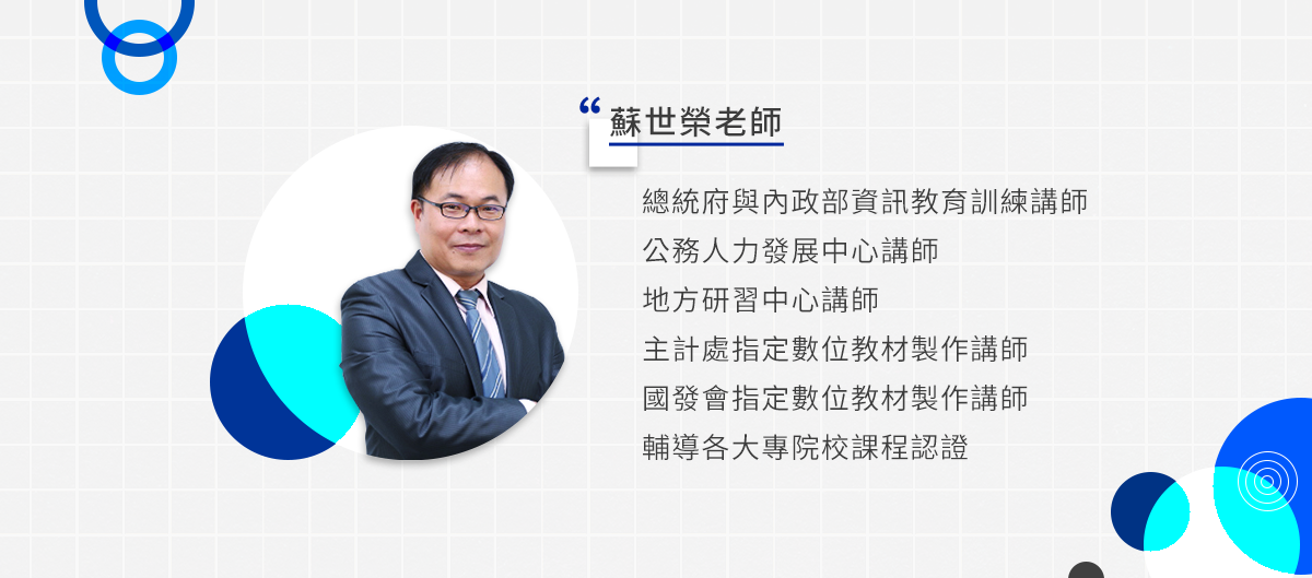 蘇世榮老師的專業強項在於辦公室文件(Office軟體)的資訊化與快速整合運用,以及ODF導入和轉檔,教學時擅長以實際案例將複雜內容清楚表達,並在各個政府機關和大專院校擔任過專任講師,致力教學,經驗豐富,教齡長達25年,更有眾多精采的著作。