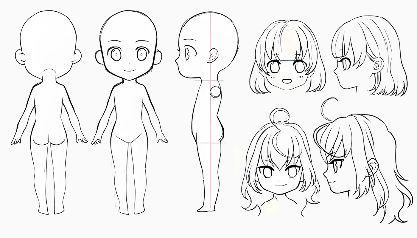 從三視圖開始解析 Q 版人物骨架比例,男生與女生正面、側面、表情設計、髮型的繪製重點,以及初學者最常出錯的頭部動態角度的繪製技巧。