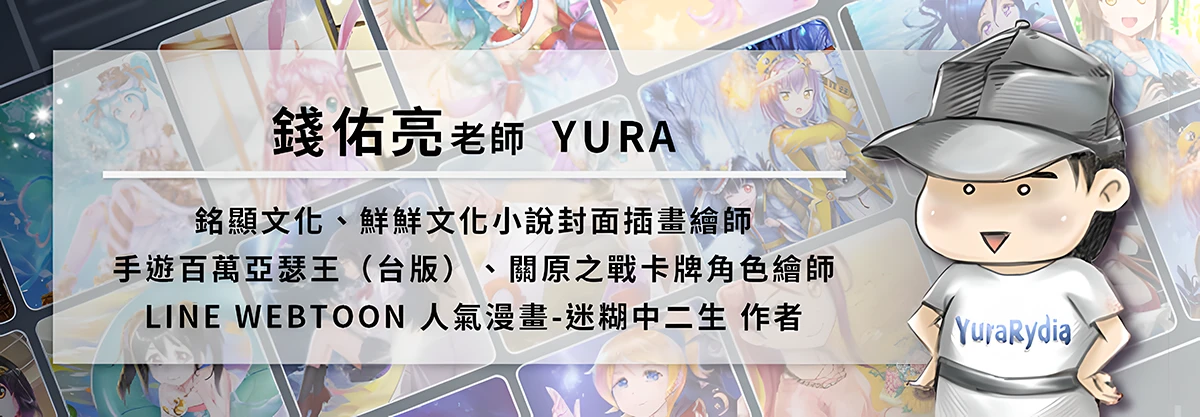 YURA 老師對畫圖充滿熱忱,雖不是本科系出身,卻自學成為原畫設計師,並且對 Photoshop、CSP、Painter 等繪圖軟體皆相當熟悉,擅長日系動漫風格的角色創作,曾幫各大出版社繪製小說封面、內頁插畫,也設計過知名手遊的卡牌人物,目前主要從事電繪插畫、漫畫的工作。