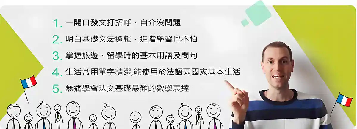 A0開始學習到A1,專屬為無基礎想去法國或法語國家留學、旅遊、想認識法文的學生等所設計獨一無二的有趣課程。