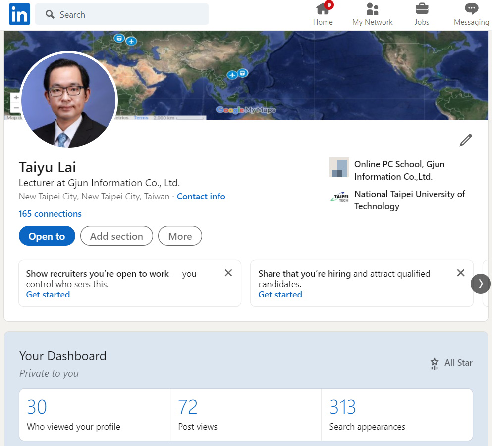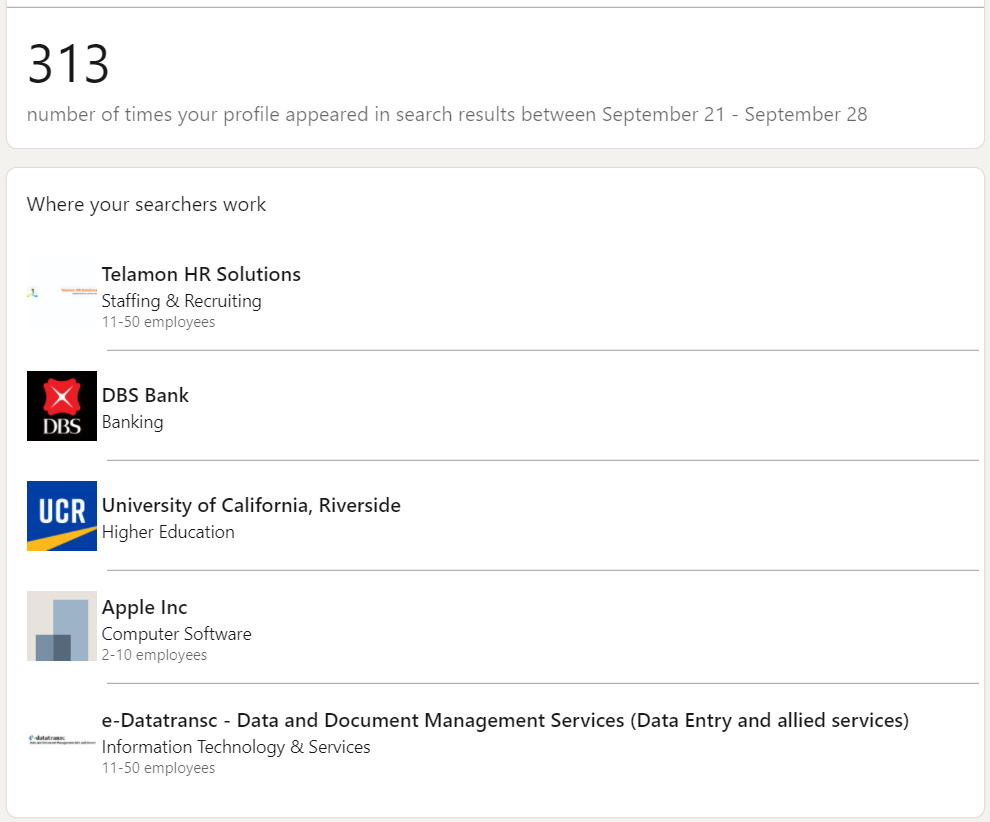 老師本身也在 LinkedIn 建立履歷表,由於擁有許多證照,即使已過求職高峰期,一星期仍被搜尋 313 次。如此的高搜尋率,對你在找工作上相當有幫助。是時候加入 LinkedIn,考取專業技能測驗,讓你的能力被更多人看見!