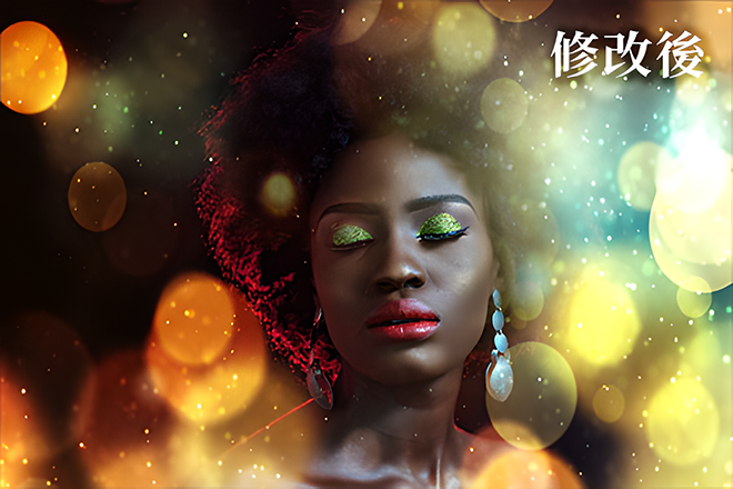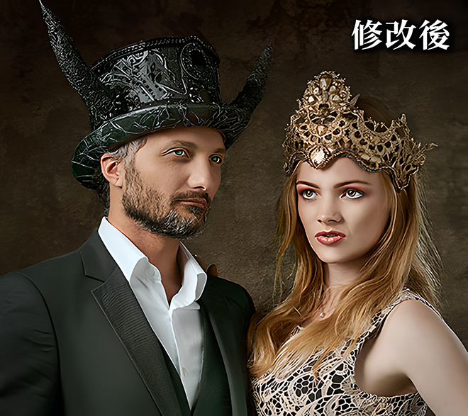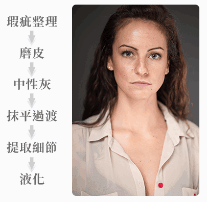 最後修飾臉部五官與骨架身形,調整輪廓。其中也可選擇性的數位上妝、整理髮絲、調整衣服質感與點綴指甲光澤等等,以打造出更精美的人像照片。