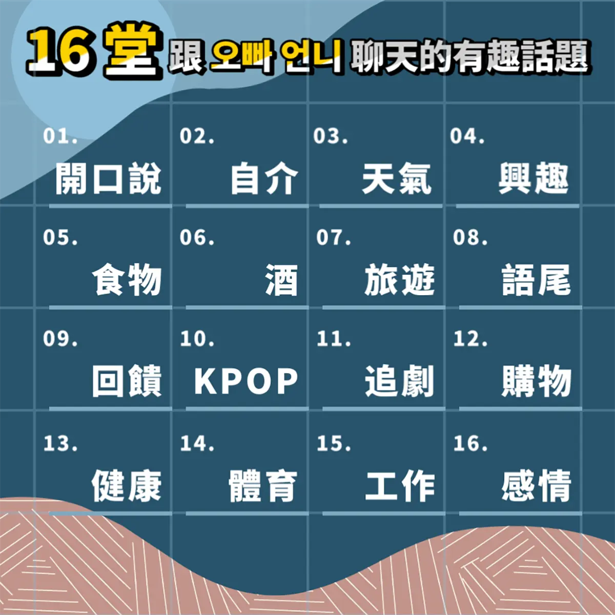 透過十六堂課程,補充韓文知識量,單字、文法、句型,艱深的內容全用情境包裝,課程有趣又好玩,上完可以有自信講韓文,用字遣詞就像真的韓國人,快速成為韓國交友圈的社交達人。