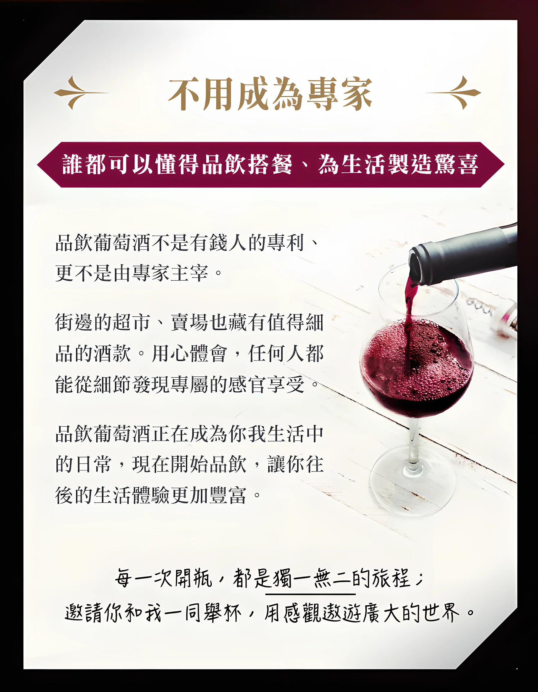 在生活中,有越來越多機會接觸葡萄酒,因此,我想把品飲與搭餐的美好體驗介紹給你。進入品酒世界的門檻並不高,只要你願意跟我一起拿起杯子,就能開始體會,讓今後的日子更加多采多姿。