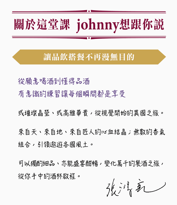 為了讓大家不受時空限制、自在地學習品飲與餐酒搭配,強尼老師特別精選了三款在超市、賣場就能採購到的酒款作為課程的示範用酒,實際帶領你體會品酒與搭餐的完整過程。