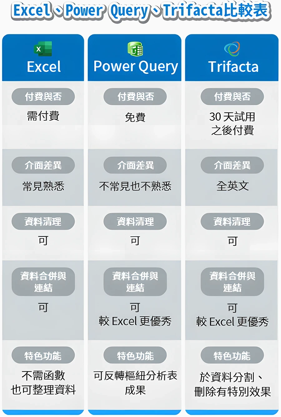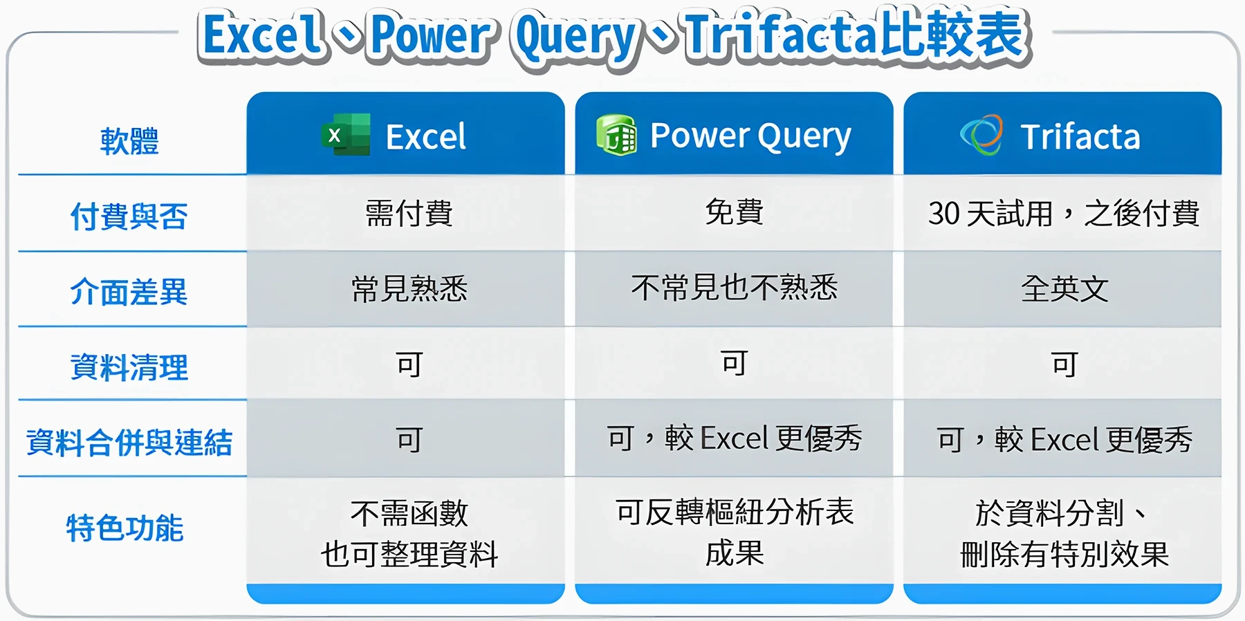 Excel、Power Query 與 Trifacta 分別有什麼特色?