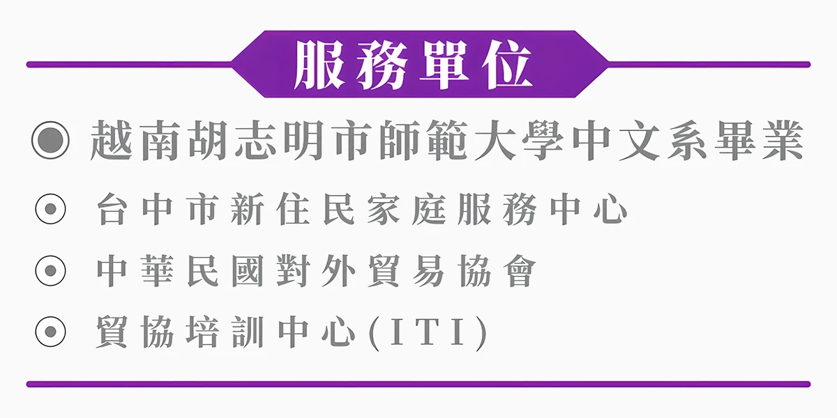在台教學10年,學生從大專院校、貿易協會等。通曉台越文化,產官學領域皆孰悉,是學生入門越南語的最佳嚮導。