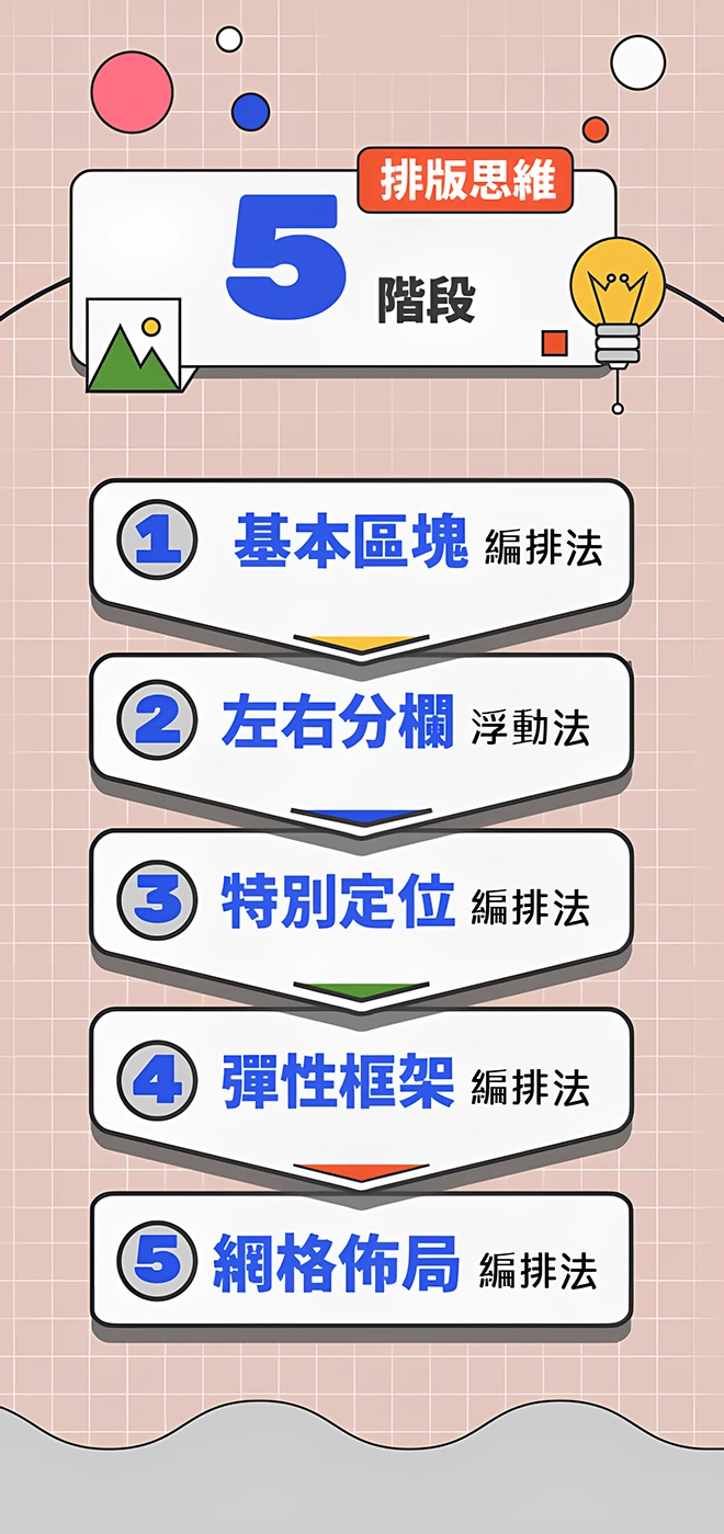 接著,開始探討網頁外觀的組成元素,涵蓋基礎組成與排版思維,帶你了解基礎網頁元素的特性,以及掌握多元排版方法。