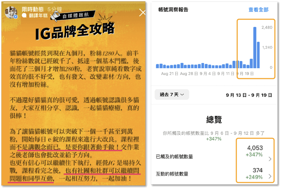 經營寵物帳號的學員先前遇到粉絲數卡關瓶頸,在課後七天內立馬使用課程所教技巧,帳號的整體成效上升,互動帳號數量成約長250%。