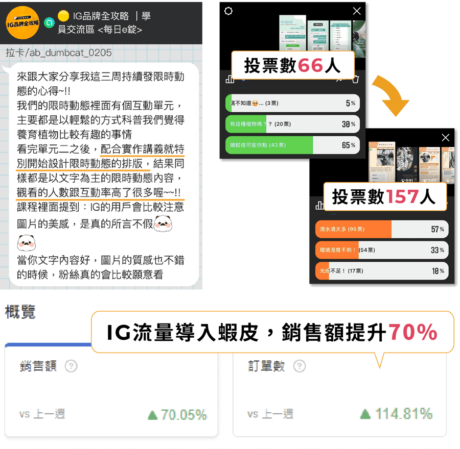 園藝商家的品牌小編在上課後優化限動視覺排版和,票選文案,使限動互動數提升兩倍,同時搭配銷售技巧,間接幫助蝦皮賣場銷售額成長70%。