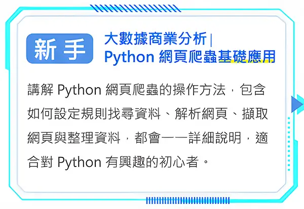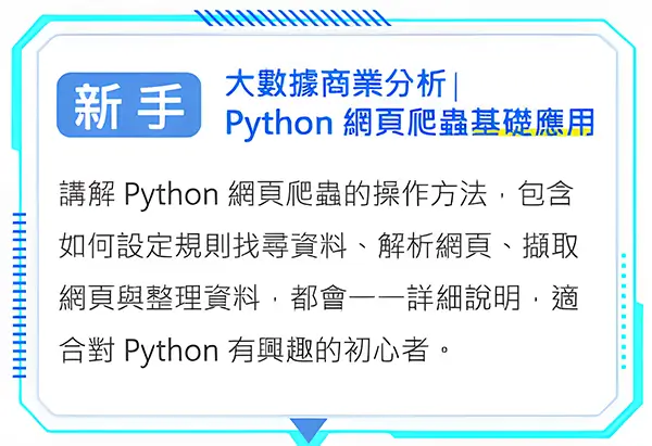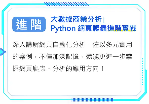 更多關於 Python 爬蟲的豐富內容,全都收錄在這堂課中,加入課程立即開啟大數據商業分析之旅吧!