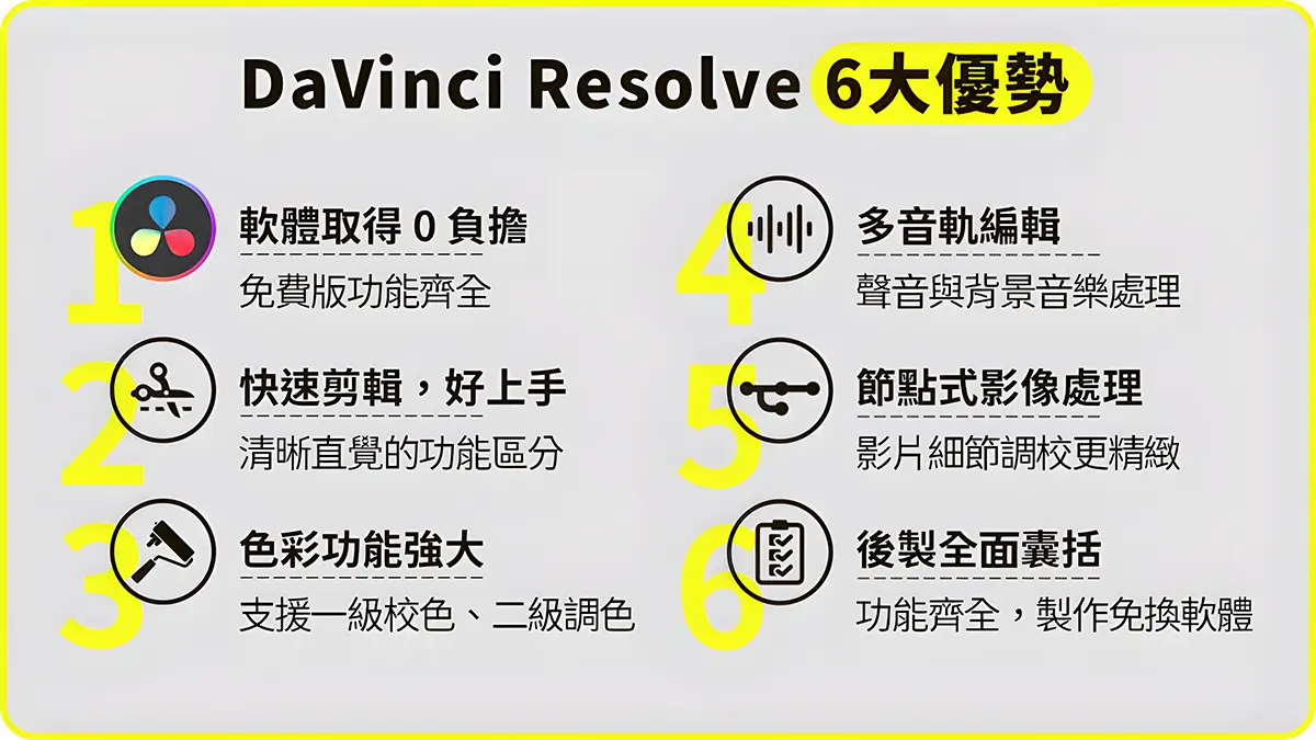 學習剪輯軟體,當然要選功能全面,效果強大的專業軟體!DaVinci Resolve從業餘到專業人士都適合,同款軟體讓你從興趣開始,日後也能輕鬆接軌專業製作。