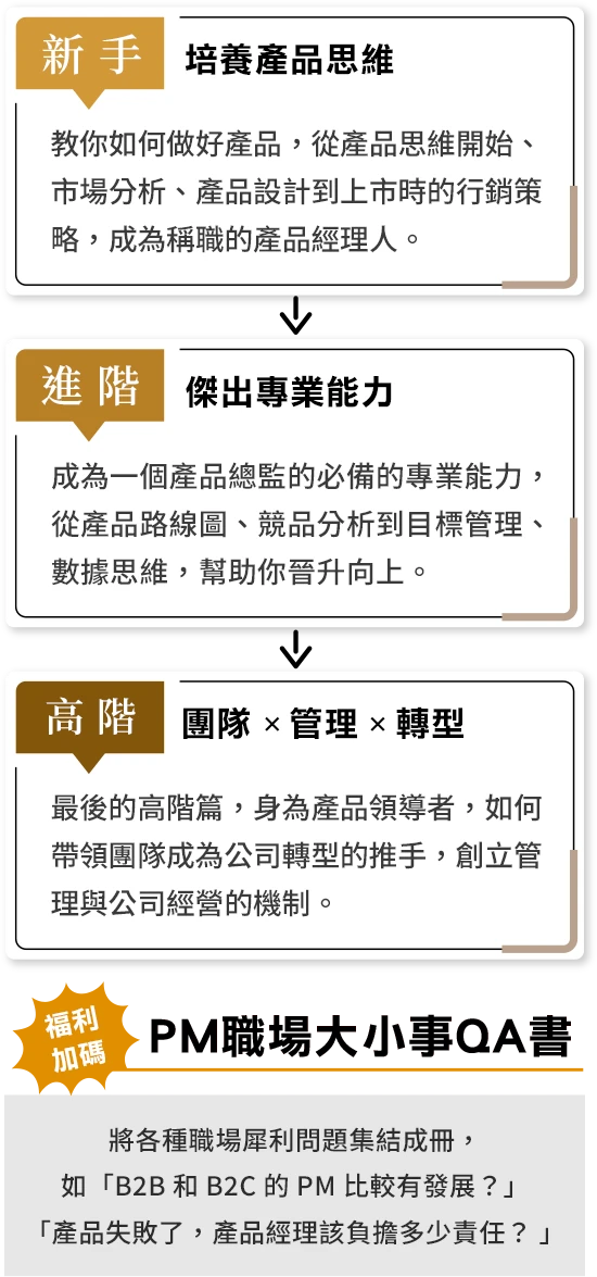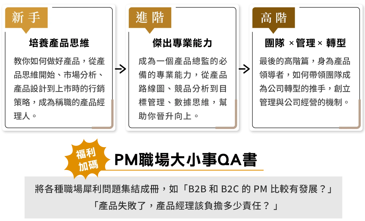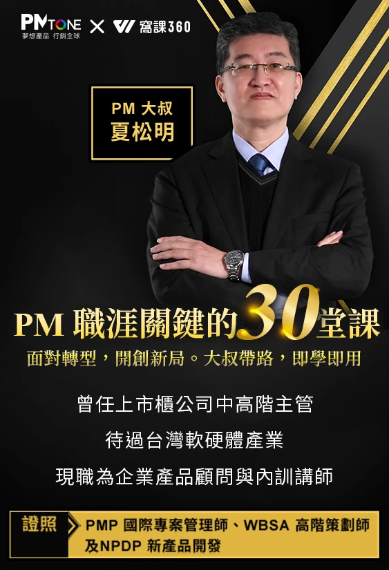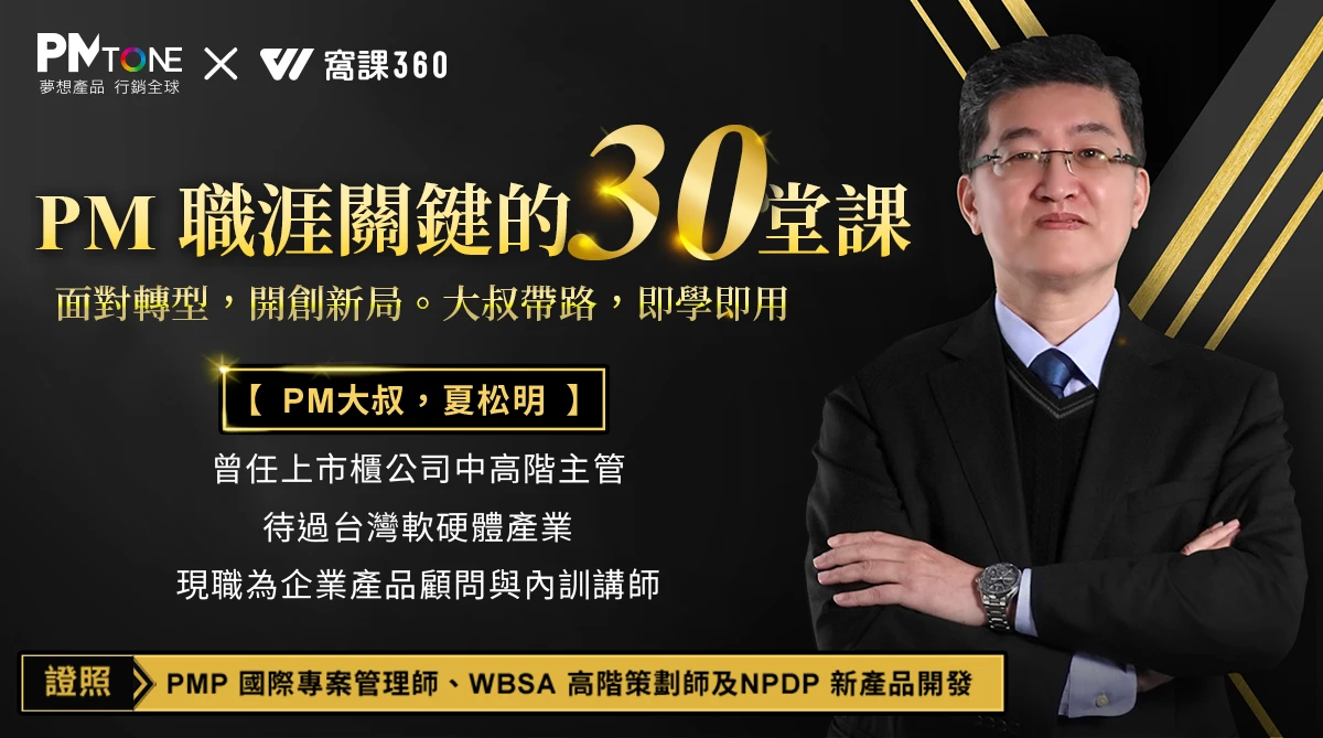 PM 大叔以 20 多年來擔任產品經理、企業顧問的經驗,設計了 30 堂關鍵 PM 課程,從「新手」、「進階」、到「高階」,除了整理了 PM 必學的技能、更有國內外的商業思維和案例分析,提供了 PM 一個具體的職涯發展地圖,可用來檢視目前所在的位置與該具備的能力。